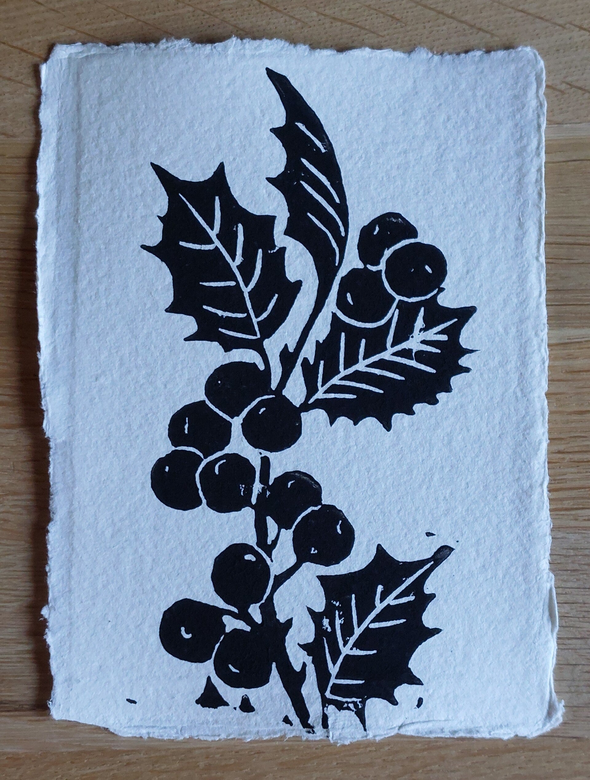 Linodruk met zwarte inkt op handgeschept (A6) papier.