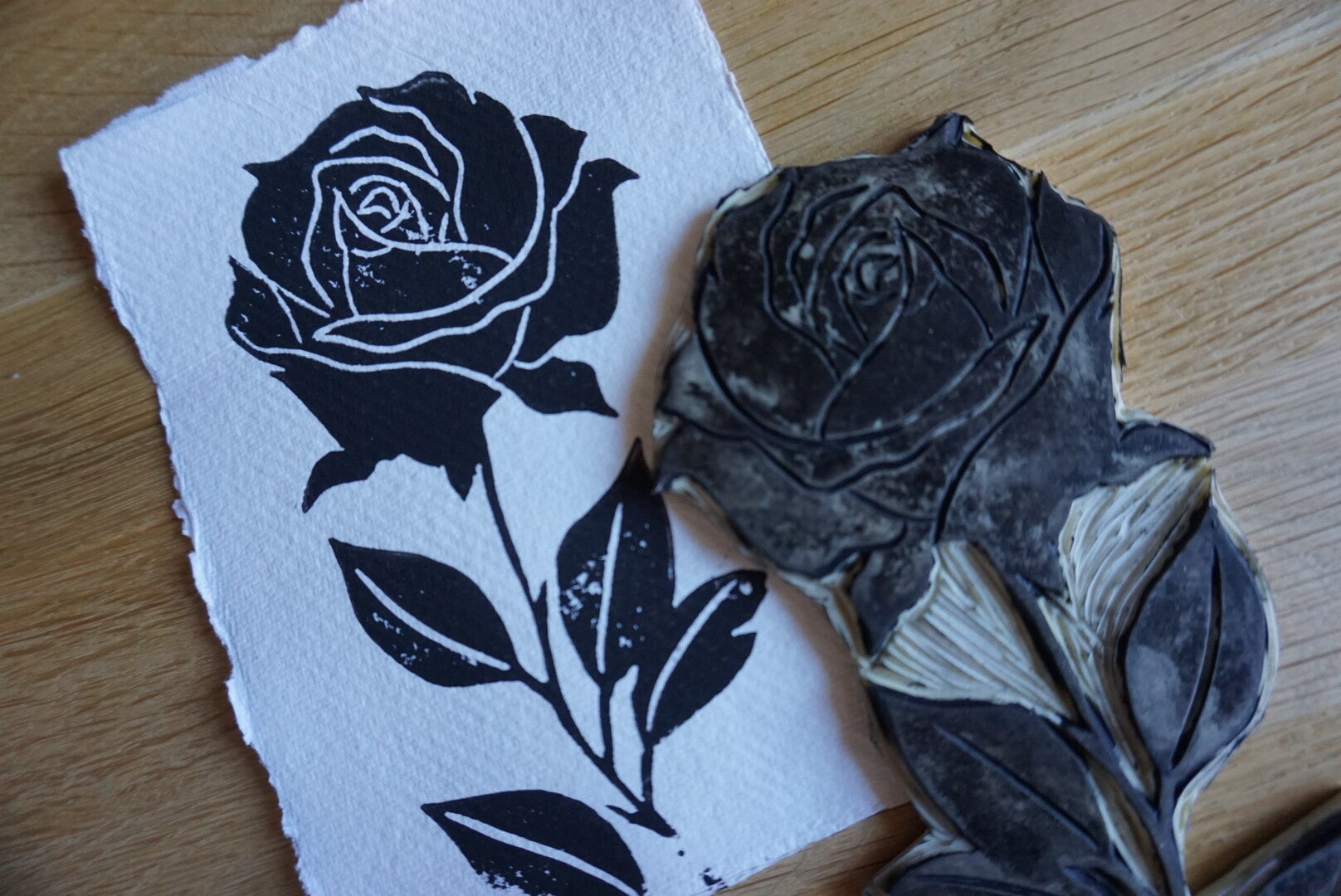 Linodruk met zwarte inkt op handgeschept (A6) papier.