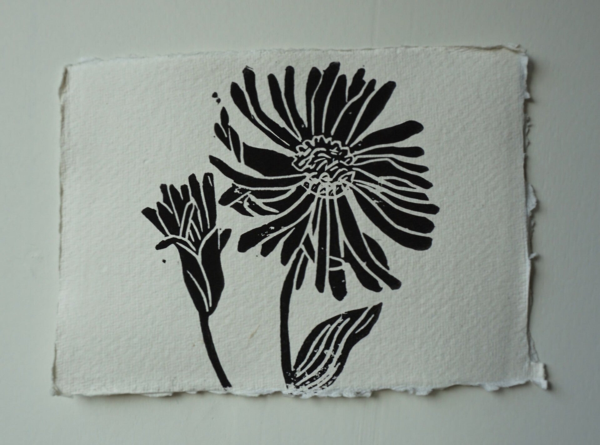 Linodruk met zwarte inkt op handgeschept (A6) papier.