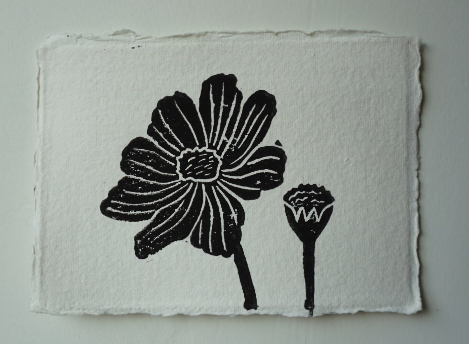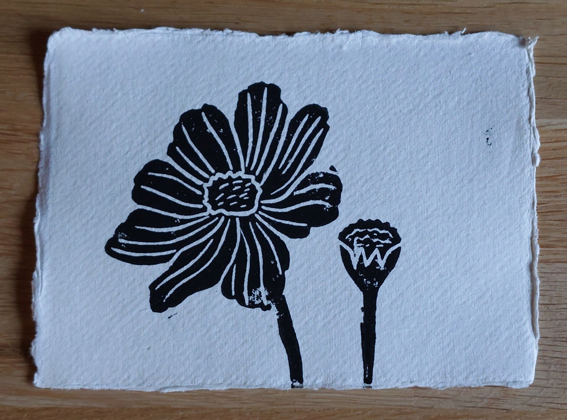 Linodruk met zwarte inkt op handgeschept (A6) papier.