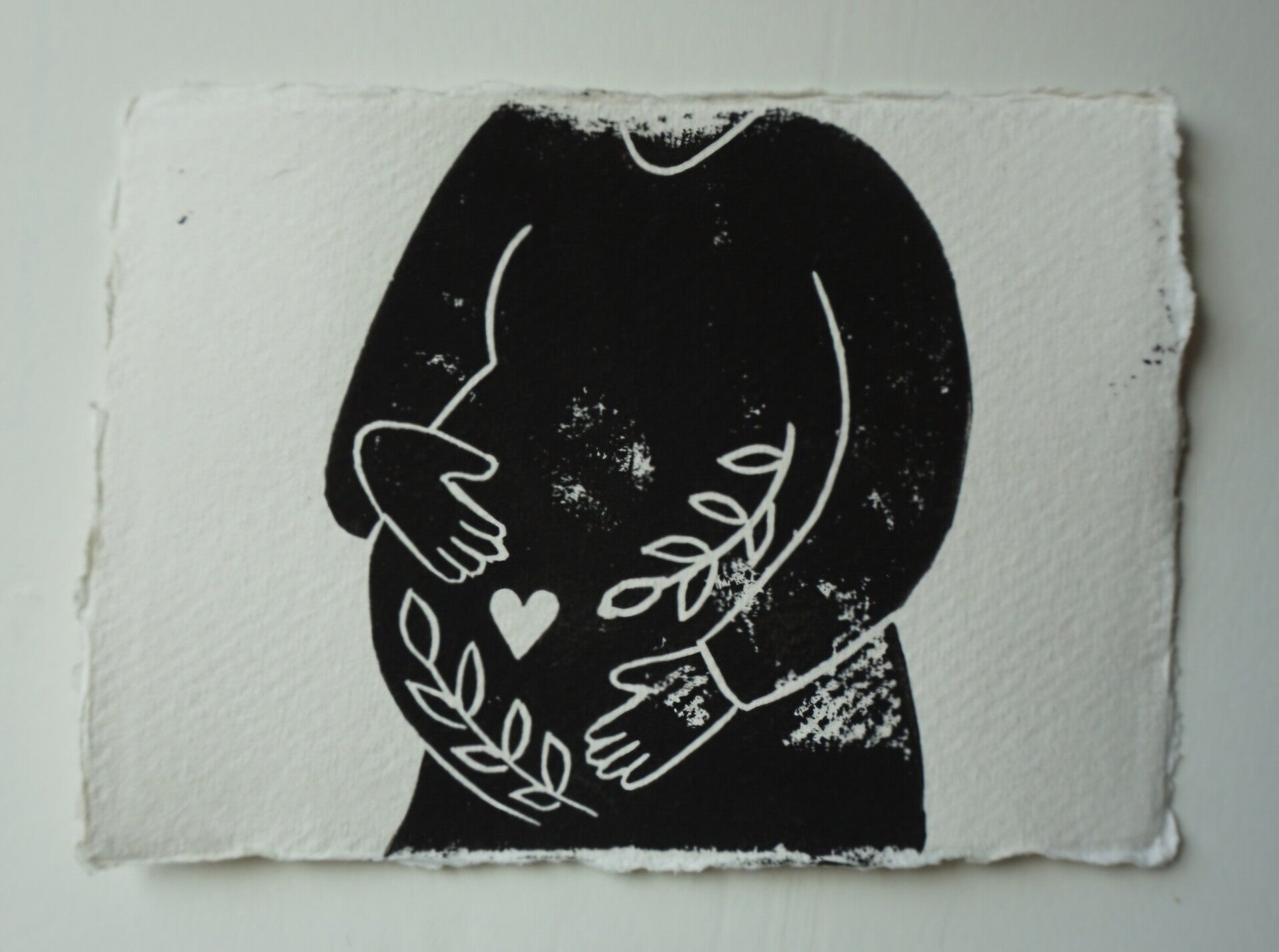 Linodruk met zwarte inkt op handgeschept (A6) papier.