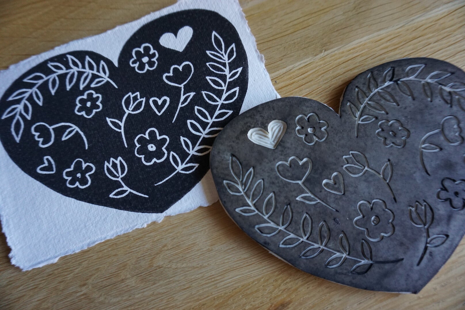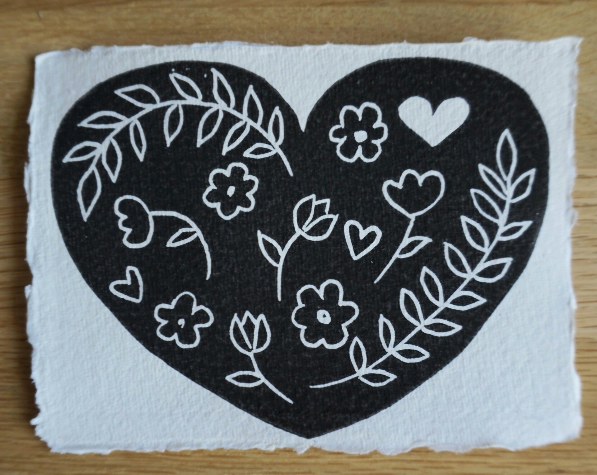 Linodruk met zwarte inkt op handgeschept (A6) papier.