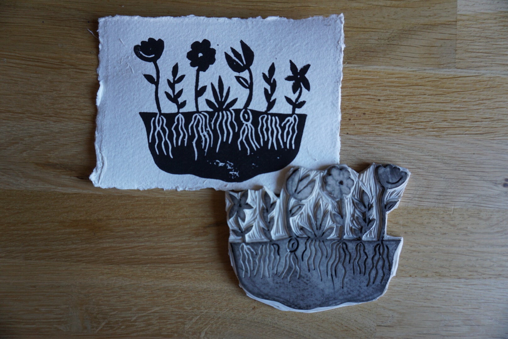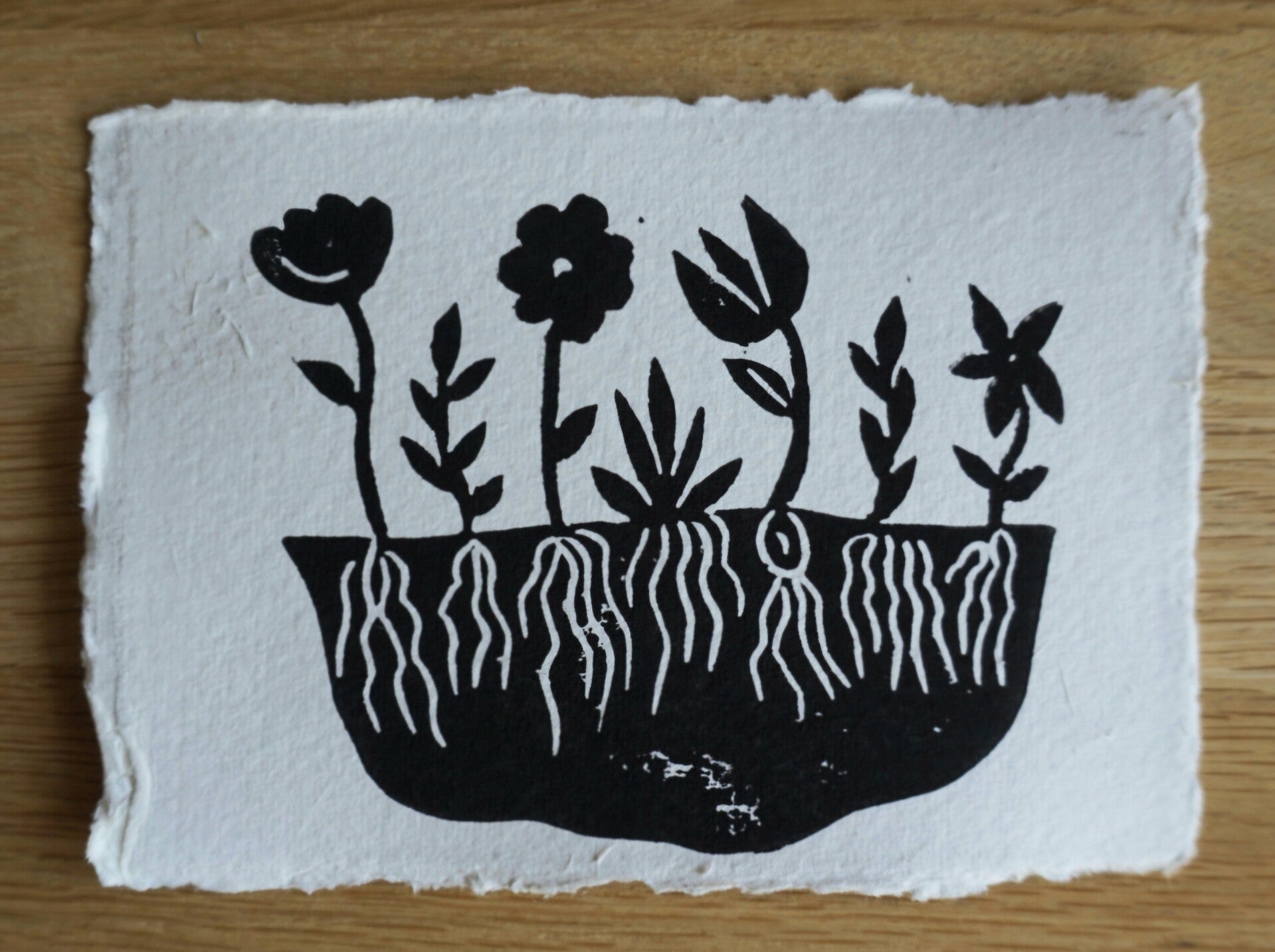 Linodruk met zwarte inkt op handgeschept (A6) papier.