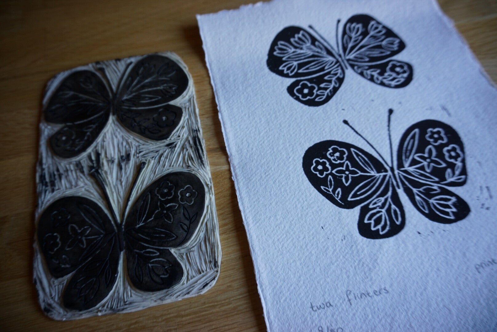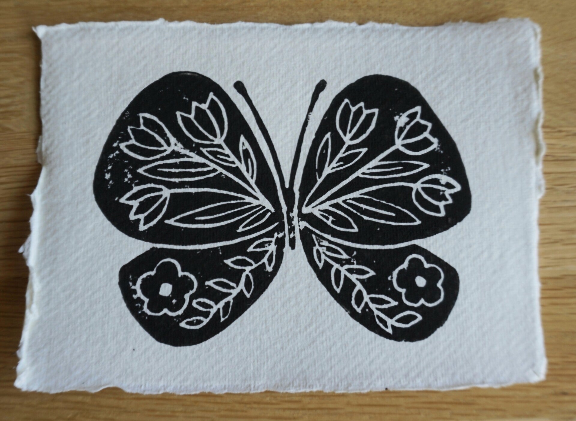 Linodruk met zwarte inkt op handgeschept (A6) papier.