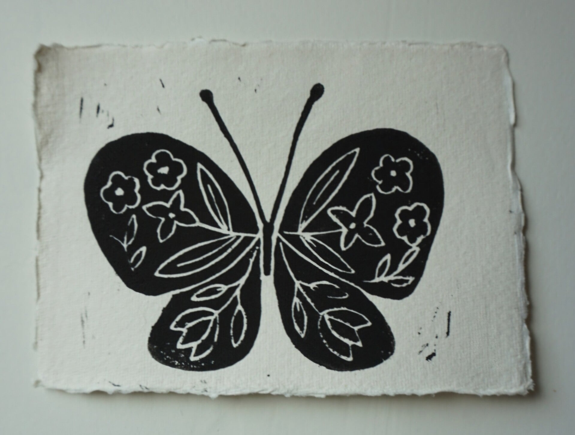 Linodruk met zwarte inkt op handgeschept (A6) papier.