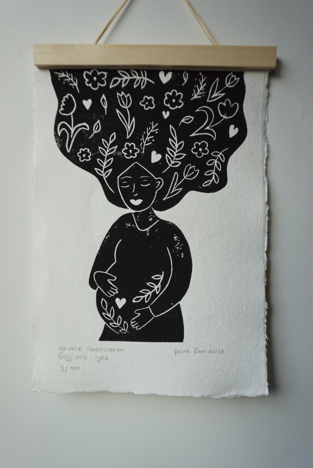 Linoprint A4 poster: linodruk met zwarte inkt op handgeschept papier.